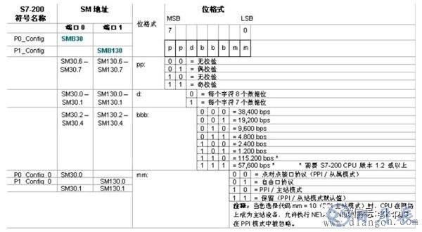 應(yīng)用自由口通信首先要把通信口定義為自由口模式,同時設(shè)置相應(yīng)的通信波特率和上述通信格式。用戶程序通過特殊存儲器SMB30(對端口0)、SMB130(對端口1)控制通信口的工作模式。詳見下圖