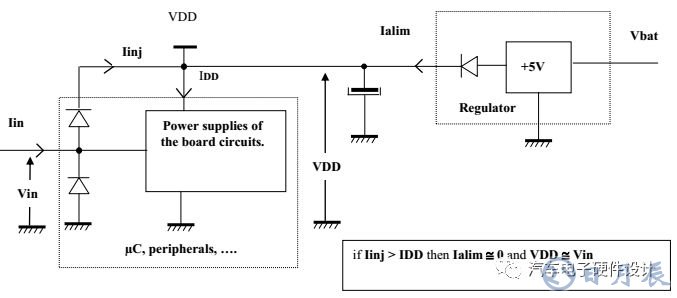 如果注入電流高于板電源電流的總和(µC和其他電路),調(diào)壓器不能完全執(zhí)行其功能和電源電壓可能超過推薦的范圍和破壞產(chǎn)品的組件和集成電路。