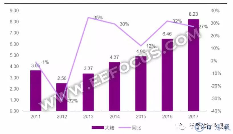 據(jù)Semi預(yù)測(cè),2018年中國(guó)的設(shè)備銷售增長(zhǎng)率將創(chuàng)新高,為49.3%,達(dá)到113億美元,中國(guó)大陸將緊隨韓國(guó),成為世界第二大半導(dǎo)體設(shè)備需求市場(chǎng)。