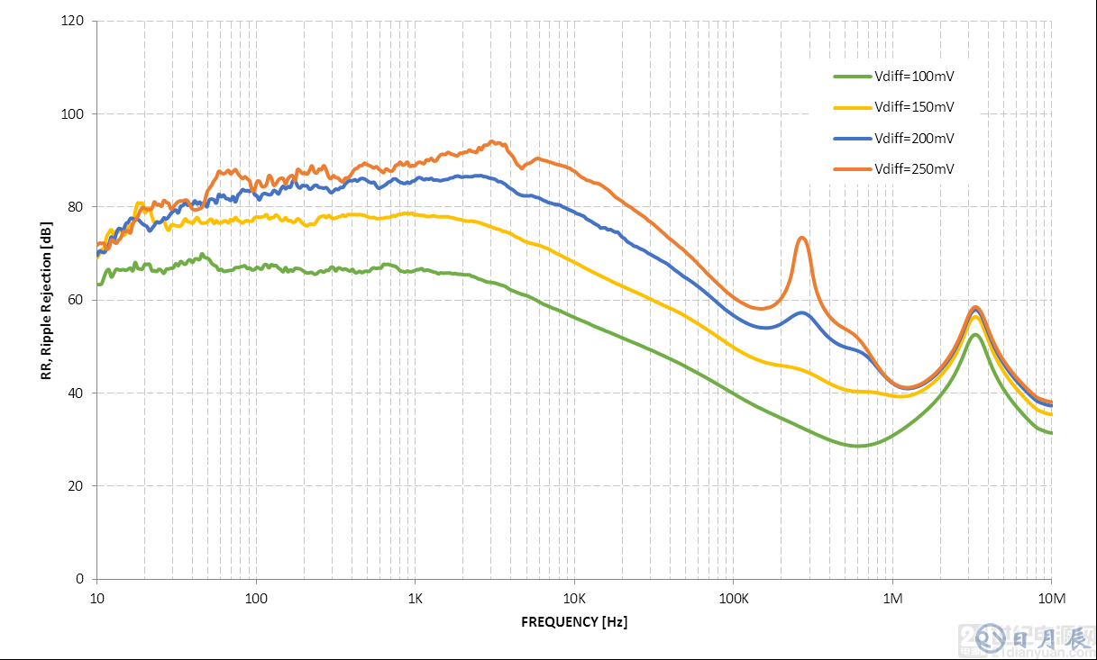 PSRR描述LDO抑制輸入源紋波電壓的能力,可用以下公式表示:
