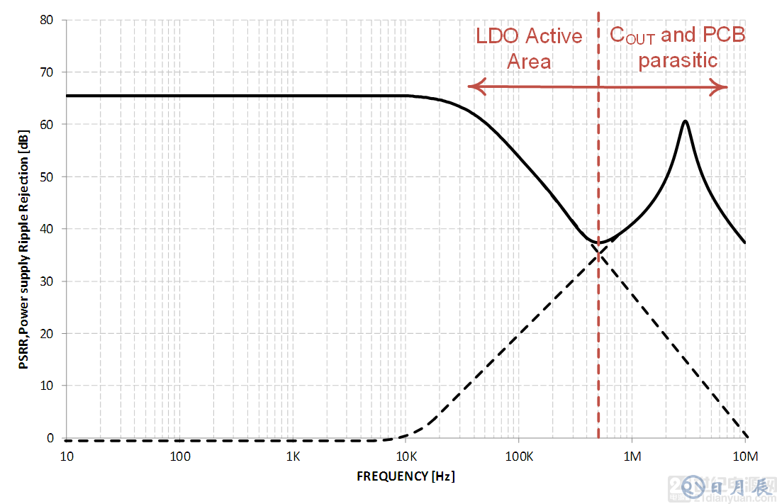 另一個(gè)區(qū)域(COUT +PCB寄生區(qū)),LDO不通過(guò)控制回路抑制輸入電壓紋波,只有一個(gè)輸出級(jí)阻抗。