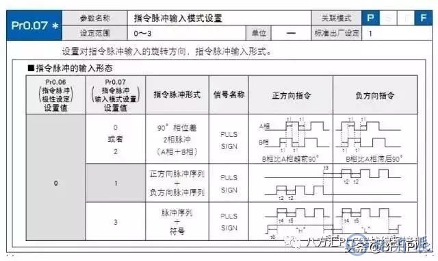 Pr0.07:伺服控制脈沖輸入方式。PLC發(fā)送高速脈沖給伺服驅(qū)動器,有幾種方式,可以是正轉(zhuǎn)一路脈沖,反轉(zhuǎn)一路脈沖;也可以是只用一路脈沖,而增加一個方向控制信號(高低電平即可),當(dāng)然也可以是90°相位差的2相脈沖,Pr0.07分別設(shè)置為“1”、“3”、“0”或“2”??梢钥闯龀嗽O(shè)置為“3”只需一路脈沖就可實(shí)現(xiàn)定位控制,其他三者都需要兩路脈沖,對于一個軸控制(即一套伺服系統(tǒng))三菱PLC都沒有問題,如果是兩個軸控制,則必須將Pr0.07設(shè)置為“3”,缺省值為“1”,因此此參數(shù)一般都需要設(shè)置。當(dāng)然此參數(shù)與Pr0.06配合設(shè)置,可選擇輸入的脈沖極性。