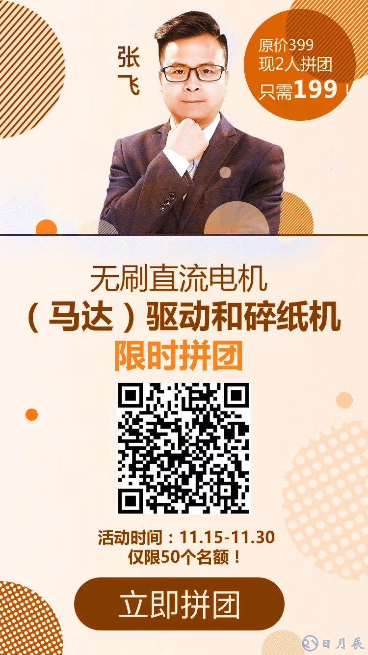 從本月15日至30日,您報(bào)名參與《張飛無刷直流馬達(dá)(驅(qū)動)和碎紙機(jī)》課程,并邀請您的任一好友參加本次課程拼團(tuán),即可享受活動特惠拼團(tuán)價(jià)!