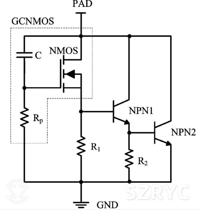 GCNMOS 是一種改進的 ESD 防護結(jié)構(gòu),其基本工作原理是,當(dāng)輸入電壓超過一定的閾值時,NMOS 的柵極和漏極之間會形成一個擊穿通道,將過高的電壓引導(dǎo)到地線。