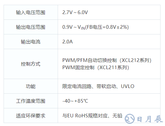 輸入電壓范圍在2.7V~6.0V之間。輸出電壓可用電阻從0.9V任意設(shè)定。XCL211的頻率被固定,可以抑制輸出紋波。XCL212通過(guò)在輕負(fù)載時(shí)降低工作頻率,實(shí)現(xiàn)了從輕負(fù)載到重負(fù)載整個(gè)區(qū)域內(nèi)的高效率。軟啟動(dòng)時(shí)間設(shè)定為1ms(TYP.),可以使輸出電壓高速啟動(dòng)。限定電流功能被設(shè)定為4.0A(TYP.)。內(nèi)置了UVLO(Under VoltageLock Out)功能,當(dāng)輸入電壓在2.4V(TYP.)以下時(shí),強(qiáng)制停止內(nèi)部驅(qū)動(dòng)晶體管工作。當(dāng)CE=Low時(shí),利用CL放電功能將CL(負(fù)載電容)中的電荷放電,將消耗電流抑制在1.0μA以下。