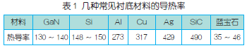 LED是一種固態(tài)的半導(dǎo)體器件,而LED芯片的表面面積較小,工作時(shí)電流密度大,且用于照明時(shí)往往要求多個(gè)LED組合而成。LED密集度大,導(dǎo)致芯片發(fā)熱密度高,而結(jié)溫上升會(huì)導(dǎo)致光輸出減少,芯片加快蛻化,縮短器件壽命。表1給出了幾種不同材料的熱導(dǎo)率??梢钥闯?,目前在功率型LED的制備中,技術(shù)最為成熟、使用最多的藍(lán)寶石襯底的熱導(dǎo)率只有35~46W/(m×K),不足Si材料的1/4。