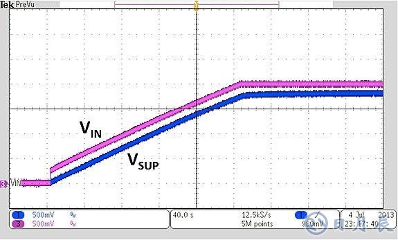在以上實(shí)例中,升壓充電器IC以冷啟動(dòng)模式起動(dòng),此時(shí)VIN調(diào)節(jié)為接近330mV。在冷啟動(dòng)過程中,連接至VBAT引腳的超級(jí)電容器通過一個(gè)內(nèi)部二極管從VSTOR充電,導(dǎo)致VSTOR與VSUP之間存在0.3V的壓差。當(dāng)VSTOR到達(dá)1.8V,即達(dá)到IC退出冷啟動(dòng)模式的內(nèi)部閾值,器件就進(jìn)入常規(guī)充電模式,充電效率顯著提高。這可從充電曲線的坡度突變觀察到。在達(dá)到過壓條件之前的常規(guī)充電模式下,太陽能電池穩(wěn)壓在大約1.6V,接近其MPP。當(dāng)超級(jí)電容器達(dá)到使用電阻器ROV1與ROVlx780.com2設(shè)定的過壓點(diǎn)4.2V時(shí),充電結(jié)束。