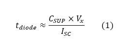 二極管充電器的主要優(yōu)勢(shì)在于其為徹底放電狀態(tài)的超級(jí)電容器充電所需的時(shí)間。圖2是120mF超級(jí)電容器如何采用支持ISC=1mA短路電流以及VOC=2V開路電壓的3S太陽能電池從完全放電狀態(tài)進(jìn)行充電。粉色線對(duì)應(yīng)的是太陽能電池輸出(VIN),而藍(lán)色線則對(duì)應(yīng)的是超級(jí)電容器的電壓(VSUP)。超級(jí)電容器從0V充電到1.8V耗時(shí)約為205秒。VIN與VSUP之間的差異即為二極管上的壓差。使用二極管充電器為超級(jí)電容器充電到 VX 電壓所需的時(shí)間可大致用等式1表達(dá):