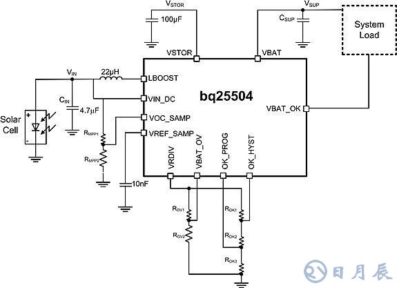 二極管充電的不足可使用專門用于與能源采集設(shè)備配套使用的集成電路克服。這類器件之一即為bq25504。這是一款超低靜態(tài)電流充電器IC,可對(duì)所連接的能源采集器進(jìn)行最大功率點(diǎn)跟蹤(MPPT)。圖3是如何使用該器件為超級(jí)電容器充電的示意圖,為了清楚起見,圖中只顯示了必用的引腳。電阻器ROV1與ROV2zjgztb.com用于設(shè)置超級(jí)電容器的過壓閾值。電阻器ROK1、ROK2與ROK3用于設(shè)置VBAT_OK信號(hào)的上下閾值,其可用于控制系統(tǒng)負(fù)載,以防超級(jí)電容器過度放電。太陽能電池與引腳VIN_DC相連。