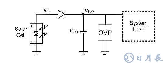 通過太陽能電池為超級(jí)電容器充電的最簡(jiǎn)單方法是使用二極管。在普通光照條件下,即使考慮到二極管造成的損耗,超級(jí)電容器也可充電到太陽能電池的開路電壓。圖1是超級(jí)電容器在二極管幫助下充電的原理圖。大多數(shù)系統(tǒng)都需要一個(gè)輔助過壓保護(hù)電路,以保護(hù)超級(jí)電容器以及后續(xù)的負(fù)載電子設(shè)備。
