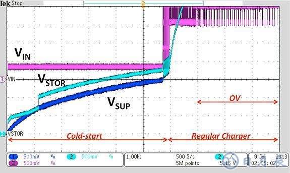 由于超級(jí)電容器在過長(zhǎng)時(shí)間沒有采集能源輸入時(shí),通常會(huì)一直放電到0V,因此系統(tǒng)需要從蓄能電容器完全放空的情況下啟動(dòng)。大多數(shù)專用能源采集充電器IC都具有冷啟動(dòng)特性,只要輸入電源電壓高于一定水平,就能啟動(dòng)為處于完全放電狀態(tài)的蓄能元件充電。本例中電壓值為330mV。