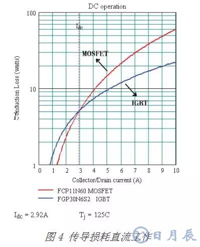 在比較額定值為600V的器件時,IGBT的傳導(dǎo)損耗一般比相同芯片大小的600 V MOSFET少。這種比較應(yīng)該是在集電極和漏極電流密度可明顯感測,并在指明最差情況下的工作結(jié)溫下進行的。例如,F(xiàn)GP20N6S2 SMPS2 IGBT 和 FCP11N60 SuperFET均具有1℃/W的RθJC值。圖4顯示了在125℃的結(jié)溫下傳導(dǎo)損耗與直流電流的關(guān)系,圖中曲線表明在直流電流大于2.92A后,MOSFET的傳導(dǎo)損耗更大。