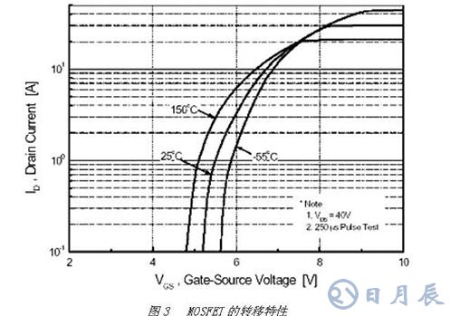 假定在導(dǎo)通時,F(xiàn)ET電流上升到10A,根據(jù)圖3中25℃的那條曲線,為了達到10A的值,柵極電壓必須從5.2V轉(zhuǎn)換到6.7V,平均GFS為10A/(6.7V-5.2V)=6.7mΩ。