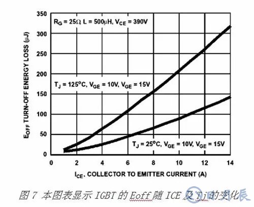 在硬開關(guān)、鉗位感性電路中,MOSFET的關(guān)斷損耗比IGBT低得多,原因在于IGBT 的拖尾電流,這與清除圖1中PNP BJT的少數(shù)載流子有關(guān)。圖7顯示了集電極電流ICE和結(jié)溫Tj的函數(shù)Eoff,其曲線在大多數(shù)IGBT數(shù)據(jù)表中都有提供。 這些曲線基于鉗位感性電路且測試電壓相同,并包含拖尾電流能量損耗。