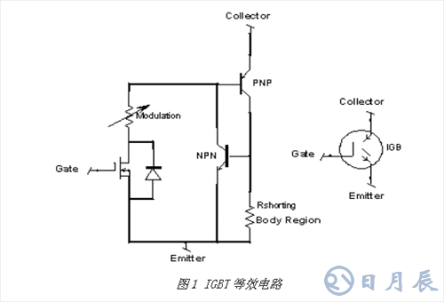除了IGBT的電壓下降時間較長外,IGBT和功率MOSFET的導(dǎo)通特性十分類似。由基本的IGBT等效電路(見圖1)可看出,完全調(diào)節(jié)PNP BJT集電極基極區(qū)的少數(shù)載流子所需的時間導(dǎo)致了導(dǎo)通電壓拖尾出現(xiàn)。