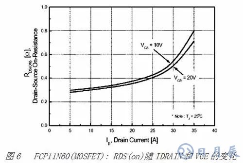 在MOSFET傳導(dǎo)極小占空比的高脈沖電流拓撲結(jié)構(gòu)中,應(yīng)該考慮圖6所示的特性。如果FCP11N60 MOSFET工作在一個電路中,其漏極電流為占空比7.5%的20A脈沖 (即5.5A RMS),則有效的RDS(on)將比5.5A(規(guī)格書中的測試電流)時的0.32歐姆大25%。