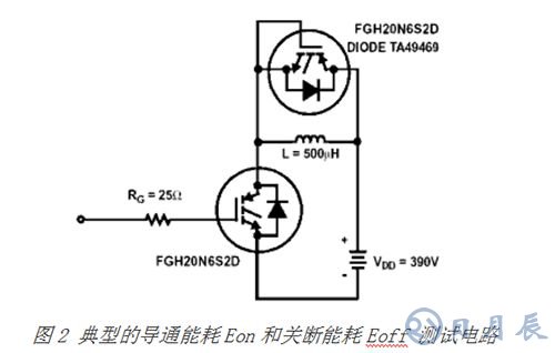 圖2顯示了用于測量IGBT Eoff的典型測試電路, 它的測試電壓,即圖2中的VDD,因不同制造商及個別器件的BVCES而異。在比較器件時應(yīng)考慮這測試條件中的VDD,因為在較低的VDD鉗位電壓下進行測試和工作將導(dǎo)致Eoff能耗降低。