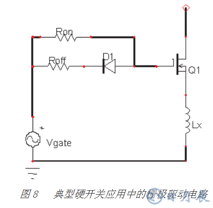 MOSFET的Eoff能耗是其米勒電容Crss、柵極驅(qū)動速度、柵極驅(qū)動關(guān)斷源阻抗及源極功率電路路徑中寄生電感的函數(shù)。該電路寄生電感Lx (如圖8所示) 產(chǎn)生一個電勢,通過限制電流速度下降而增加關(guān)斷損耗。在關(guān)斷時,電流下降速度di/dt由Lx和VGS(th)決定。如果Lx=5nH,VGS(th)=4V,則最大電流下降速度為VGS(th)/Lx=800A/μs。