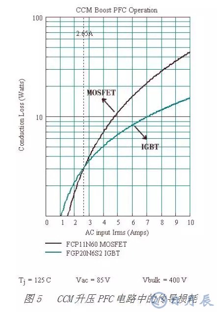 圖5中的示例僅考慮了CCM PFC電路的傳導(dǎo)損耗,即假定設(shè)計目標(biāo)在維持最差情況下的傳導(dǎo)損耗小于15W。以FCP11N60 MOSFET為例,該電路被限制在5.8A,而FGP20N6S2 IGBT可以在9.8A的交流輸入電流下工作。它可以傳導(dǎo)超過MOSFET 70% 的功率。