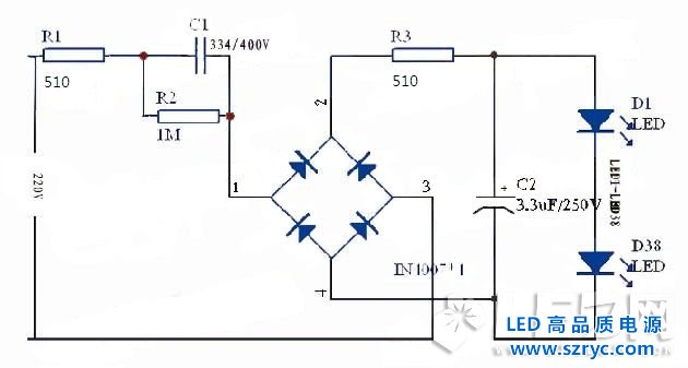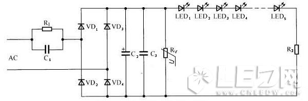 在圖中,電容C1的作用是降壓和限流;VD1~VD4的作用是整流,用于將交流電整VD1~VD4可選擇1N4007系列的整流二極管。C2、C3的作用為濾 波,用于將整流后的脈動直流電壓濾波成平穩(wěn)的直流電壓。C2、C3的耐壓應(yīng)根據(jù)負(fù)載電壓而定,一般為負(fù)載電壓1.2倍,其電容容量視負(fù)載電流的大小而定。壓敏電阻Rv(或瞬變電壓抑制二極管)的作用是將輸入電源中瞬間的脈沖高壓對地泄放掉,從而保護(hù)LED不被瞬間高壓擊穿。