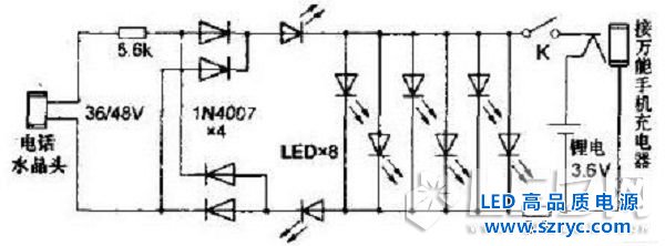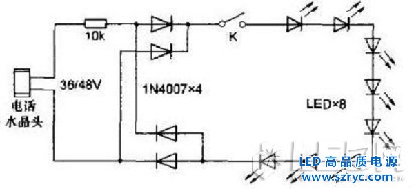 又稱免電燈(即網(wǎng)上賣家俗稱的緬甸燈),因?yàn)樗捎闷胀矣霉潭娫挼倪M(jìn)線電壓做電源,無需電池或交流市電,把尾部的水晶頭插入電話分機(jī)接口即可照明,不用另交電費(fèi),也不用擔(dān)心停電。此外還能兼作電話來電閃爍燈.提醒聽力不太好的老年人及時(shí)接電話,因電話摘機(jī)后LED燈會熄滅,還能幫你及時(shí)發(fā)現(xiàn)電話是否被他人盜打,同時(shí)也具有一定的防雷擊保護(hù)作用。不過由于該產(chǎn)品使用的是電話所屬的電信機(jī)房饋電電源,使用時(shí)一旦索取電流過大難免會影響電話撥打和傳真收發(fā),特別是ADSL寬帶用戶撥號上網(wǎng)時(shí)容易造成頻繁掉線。圖1是電話線LED燈電路工作原理圖,36V或48V的電話線路直流電壓經(jīng)10kΩ限流電阻并由4個二極管(或整流橋)作極性變換后加在LED上,當(dāng)電話饋電電壓為36V時(shí),實(shí)測工作電流約1.2mA,亮度偏低,把限流電阻換成5.6kΩ時(shí)工作電流升為2.1mA:亮度稍微有些增加。