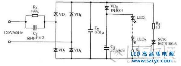 圖所示為采用可控硅的電容降壓驅(qū)動電路。在該電路中,可控硅SCR和R3組成保護(hù)電路,當(dāng)流過LED的電流大于設(shè)定值時(shí),SCR導(dǎo)通一定的角度,從而對電路中的電流進(jìn)行分流,使LED工作于恒流狀態(tài),從而避兔LED因瞬間高壓而損壞。