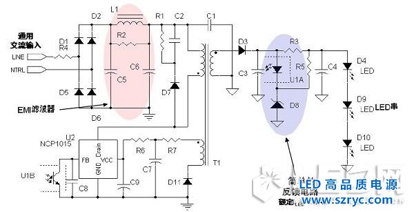 LED電源電路大多是由開關(guān)電源電路+反饋電路這樣的形式構(gòu)成,反饋電路從負(fù)載處取樣后對開關(guān)電路進(jìn)行脈沖的占空比調(diào)整或頻率調(diào)整,以達(dá)到控制開關(guān)電路輸出的目的。