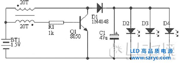 附圖中升壓變壓器可用節(jié)能燈的磁環(huán),用Φ0.21MM的漆包線雙線并繞20T,注意同名端不要接錯,LED根據(jù)需要接1-3只,調(diào)整R1使LED最亮,總電流在100MA以內(nèi)。