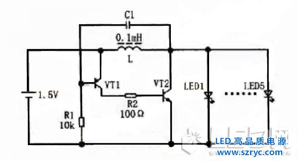 接通電源后,VT1因R1接負(fù)極,而c1兩端電壓不能突變。VT1(b)極電位低于e極,VT1導(dǎo)通,VT2(b)極有電流流入,VT2也導(dǎo)通,電流從電源正極經(jīng)L、VT2(c)極到e極,流回電源負(fù)極,電源對L充電,L儲存能量,L上的自感電動勢為左正右負(fù)。經(jīng)c1的反饋?zhàn)饔茫琕T1基極電位比發(fā)射極電位更低,VT1進(jìn)入深度飽和狀態(tài),同時(shí)VT2也進(jìn)入深度飽和狀態(tài),即Ib>Ic/β(β為放大倍數(shù))。隨著電源對c1的充電,C1兩端電壓逐漸升高,即VTI(b)極電位逐漸上升,Ib1逐漸減小, 當(dāng)Ib1<=Ic1/β時(shí),VT1退出飽和區(qū),VT2也退出飽和區(qū),對L的充電電流減小。此時(shí).L上的自感電動勢變?yōu)樽筘?fù)右正,經(jīng)c1反饋?zhàn)饔?。VT1基極電位進(jìn)一步上升,VT1迅速截止,VT2也截止,L上儲存的能量釋放,發(fā)光管上的電源電壓加到L上產(chǎn)生了自感電動勢,達(dá)到升壓的目的。此電壓足以使LED發(fā)光。
