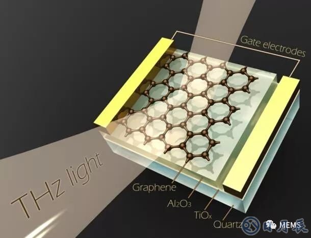 ”該器件通過在石英襯底上進行石墨烯、氧化鋁(Al2O3)和氧化鈦(TiOx)單層堆疊實現(xiàn)。一束p偏振太赫茲光束從堆棧中反射出來,當達到布魯斯特角時,反射變?yōu)榱?。添加一層石墨烯允許了可調(diào)元素的引入。當在兩個金接觸點之間的石墨烯上施加電壓時,電導率會發(fā)生變化。這改變了堆疊的布魯斯特角,因此對于給定的入射角,反射的太赫茲可以通過控制電壓而“接通或斷開”。