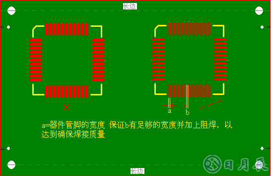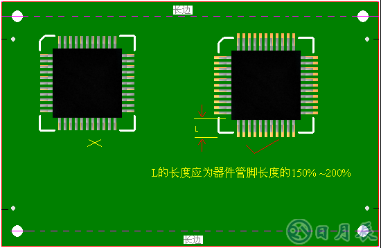 SOP、PLCC、QFP等封裝的IC畫(huà)PCB時(shí)應(yīng)延長(zhǎng)焊盤(pán),PCB上焊盤(pán)長(zhǎng)度=IC腳部長(zhǎng)度×1.5為適宜,這樣便于手工用烙鐵焊接時(shí),芯片管腳與PCB焊盤(pán)、錫三者熔為一體。如圖:
