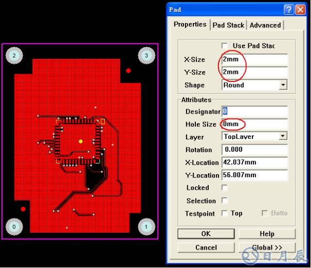 由于BGA封裝比較特殊,其焊盤(pán)都在芯片底下,外面看不到焊接效果。為了返修方便,建議在PCB板上打兩個(gè) Hole Size:30mil 的定位孔,以便返修時(shí)定位(用來(lái)刮錫膏的)鋼網(wǎng)。