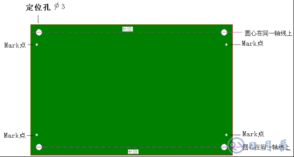PCB板的四角要留四個(gè)孔(最小孔徑 2.5mm),用于印刷錫膏時(shí)定位電路板。要求X軸或Y軸方向圓心在同一軸線上,如下圖: