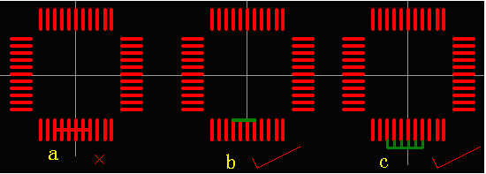 下圖a的短接方法不利于工人識(shí)別該管腳是否應(yīng)該相連,且焊接后不美觀。如果畫(huà)圖時(shí)按圖b、圖c的方法短接并加上阻焊,焊接出來(lái)的效果就不一樣:只要保證每個(gè)管腳都不相連,該芯片就無(wú)短路現(xiàn)象,而且外觀也美觀。