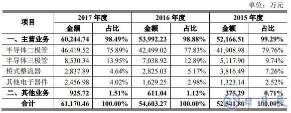 從上圖可知,銀河微電主營半導體二極管、半導體三極管和橋式整流器等產(chǎn)品,且主營業(yè)務占總營收98%以上。但隨著整機產(chǎn)品的集成度提高和生產(chǎn)制造方式的改變,部分分立器件可能被集成化產(chǎn)品所替代,部分直插產(chǎn)品可能被貼片產(chǎn)品所取代,這將會直接影響到銀河微電傳統(tǒng)市場的需求。