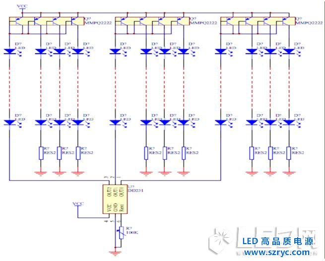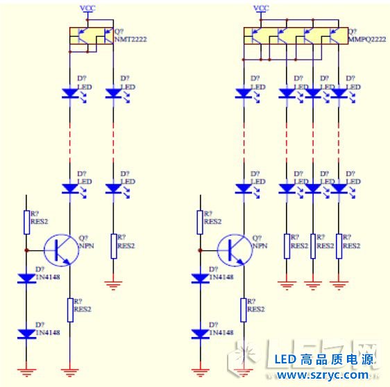 下圖采用集成三極管可以保持每路LED電流一致,這些三極管在相同溫度環(huán)境下、相同工藝條件生產(chǎn)出來(lái)的β值一樣,可以保證每路電流基本一樣。恒流部分在要求不是很高的條件下可以這樣設(shè)計(jì),穩(wěn)定的電壓或穩(wěn)定的PWM伏值驅(qū)動(dòng)穩(wěn)壓后的三極管偏壓,做到基本恒流。