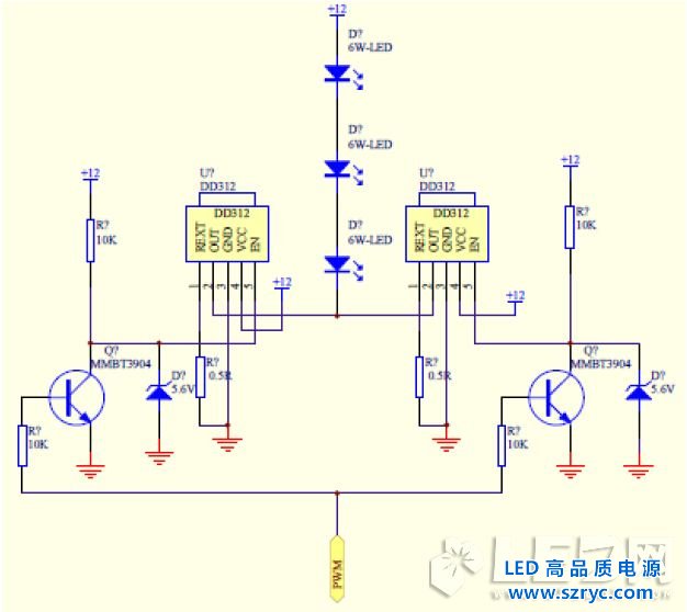 下圖采用DD312并聯(lián)參考設(shè)計(jì)直接驅(qū)動(dòng)3顆6W LED。使能PWM控制信號(hào)需要適當(dāng)?shù)母綦x,避免相互干擾和驅(qū)動(dòng)能力問(wèn)題。EN使能電壓要符合規(guī)格書(shū)要求,不要電壓太高損壞EN腳。一般IC耐壓是指負(fù)載和電源,沒(méi)有注明激勵(lì)電壓請(qǐng)不要大于5V設(shè)計(jì)。