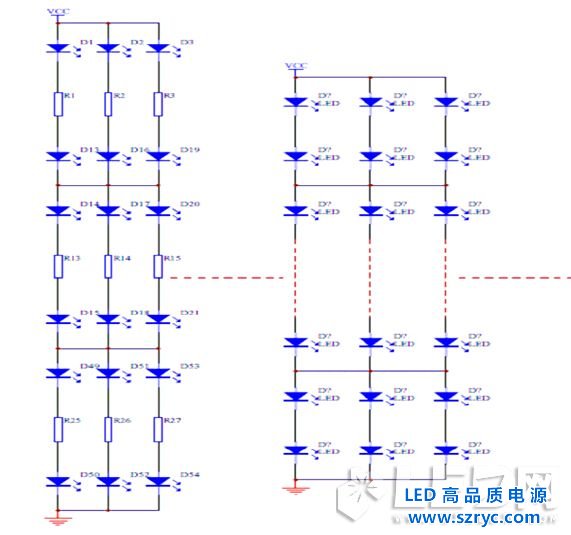 LED因其VF值特性原因做不到相同,隨著溫度及電流大小也有些VF值也會(huì)發(fā)生變化,一般不適合并聯(lián)設(shè)計(jì)。但是有些情況又不得不并聯(lián)解決多顆LED驅(qū)動(dòng)成本問(wèn)題,這些設(shè)計(jì)可以為大家做些參考。