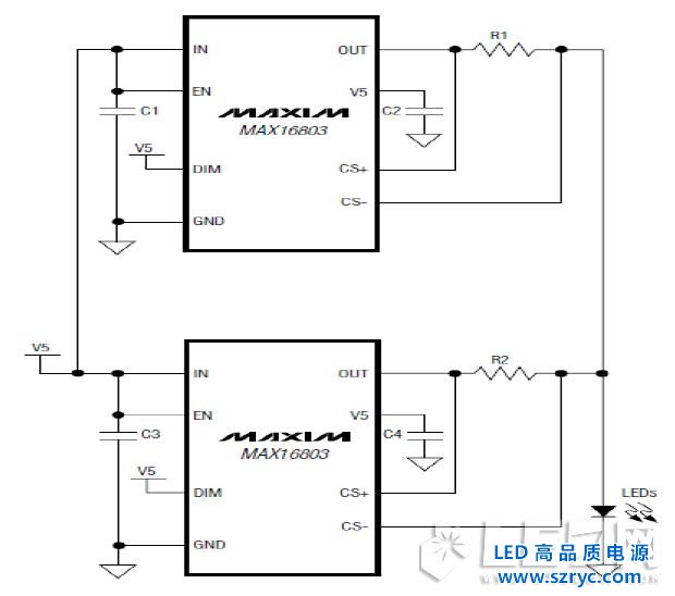 像這種檢測(cè)在LED的一端LED恒流驅(qū)動(dòng)IC也可以并聯(lián)設(shè)計(jì)驅(qū)動(dòng),實(shí)際上IC是單獨(dú)工作的,最后在并流一起。DC-DC方式是工作在較高的頻率上,需要注意的是PCB布板時(shí)避免交叉設(shè)計(jì),各自濾波、旁路電容要緊靠IC附近,負(fù)載電流最后會(huì)和即可。
