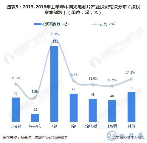 圖表5:2013-2018年上半年中國光電芯片產(chǎn)業(yè)投資輪次分布(按投資案例數(shù))(單位:起,%)