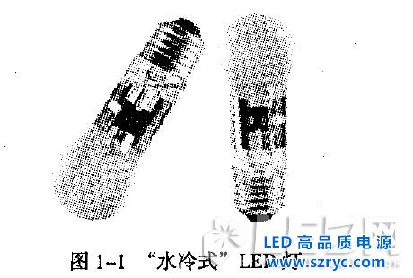液冷散熱方式是一種利用液體在泵的強制帶動下流經(jīng)散熱器表面的方式,耗散熱量的散熱技術。美國廠商Etemaleds曾推出一種“水冷式”LED燈——Etemaleds HydraLux一。它采用液冷散熱方式,不僅省去了用于冷卻燈泡內部的散熱管、散熱片及風扇等,而且沒有在燈泡的上半部分包覆散熱材料,它的光放射角擴大到了360度,如圖1-1所示。