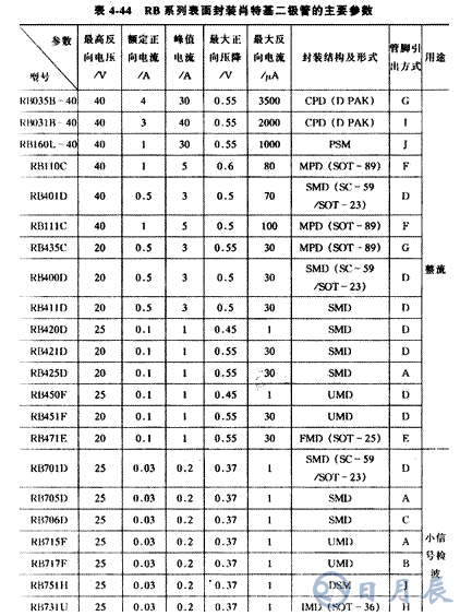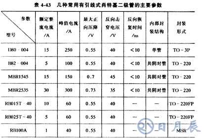 常用的有引線式肖特基二極管有D80-004、B82-004、MBR1545、MBR2535等型號(hào),各管的主要參數(shù)見下表。