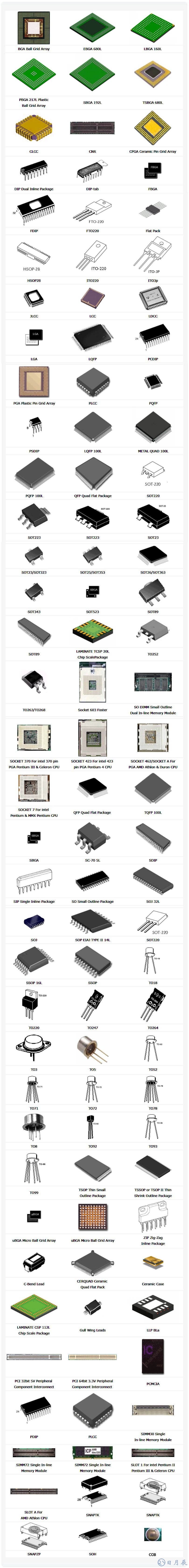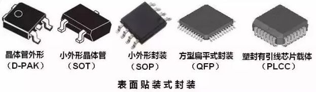 表面貼裝式封裝有晶體管外形(D-PAK)、小外形晶體管(SOT)、小外形封裝(SOP)、方型扁平式封裝(QFP)以及塑封有引線芯片載體(PLCC)等。