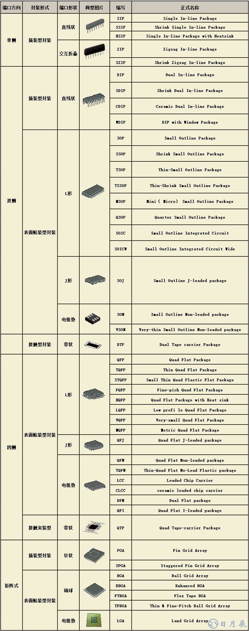 根據(jù)端口方向的不同,常見的IC封裝可分為單側(cè)、雙側(cè)、四側(cè)及矩陣式等四大類;而根據(jù)不同的封裝形式及端口形狀,還可以從上述四大類中繼續(xù)細(xì)分出若干種類型,具體可參考下表: