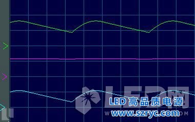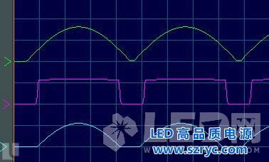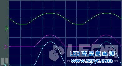 如圖1.2所示(綠線表示橋堆輸出端電壓,紅線表示LED電流,藍(lán)線表示電阻R上的電壓),LED電流有間斷(頻率為100Hz),LED電流存在的時候也有大小變化,故而表現(xiàn)為頻率為100Hz的頻閃現(xiàn)象。