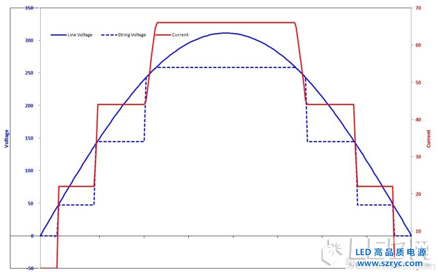 如圖4.1及4.2:線性驅(qū)動,采用一個橋堆,將50Hz的正弦波交流電變化為100Hz的半正弦波脈動直流電,然后通過線性恒流芯片根據(jù)當(dāng)前狀態(tài)下的半正弦波電壓值來分段驅(qū)動LED模塊,并且限定每一段LED的電流。簡單的說就是電壓達(dá)到第一段LED模塊工作電壓時,第一段LED工作,電流限定在紅線的第一個臺階處;電壓達(dá)到第一段LED模塊工作電壓與第二段工作電壓之和時,第一段LED和第二段LED同時工作,電流限定在紅線的第二個臺階處;電壓達(dá)到三段LED模塊工作電壓總和時,三段LED同時工作,電流限定在紅線的第三個臺階處;該驅(qū)動方式在電壓未達(dá)到第一段LED模塊工作電壓前,LED不發(fā)光,沒有損耗;電壓超過第一段LED模塊的工作電壓后,通過LED的電流由線性驅(qū)動芯片限定,表現(xiàn)為恒定電流狀態(tài),在達(dá)到后段LED工作電壓前,超出的電壓將由芯片內(nèi)部的MOS吸收,該部分能量為損耗能量。通過合理的LED串聯(lián)分段,盡可能使得三段的工作電壓擬合正弦波,充分減小損耗,驅(qū)動的效率可提升至90%以上