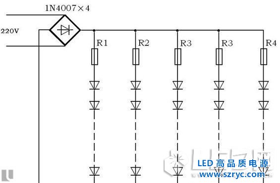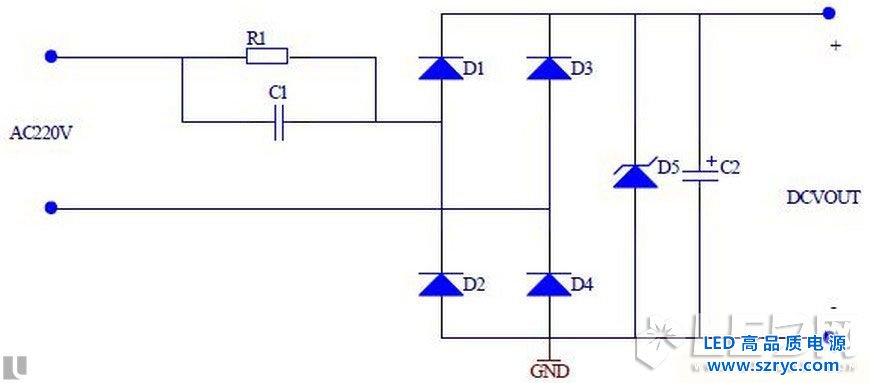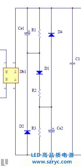 因為LED工作需要比較穩(wěn)定的直流環(huán)境,因此該方案常常采用橋式全波整流,但是全波整流產(chǎn)生浮置的地,并在零線和火線之間產(chǎn)生高壓,造成人體觸電傷害,是為比較危險的一種驅(qū)動。