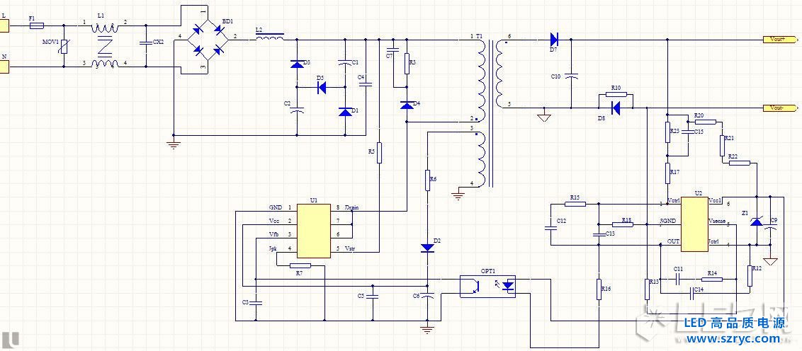 二級恒流隔離驅(qū)動,在變壓器原邊通過APFC芯片U1將驅(qū)動的功率因數(shù)提高,然后通過變壓器將電能傳遞到副邊,副邊的恒流芯片U2將輸出電流變化為恒流電流,其芯片工作頻率大多處于幾十K到幾百K赫茲的范圍。