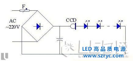 如圖2.1:恒流二極管驅(qū)動,采用一個橋堆,將50Hz的正弦波交流電變化為100Hz的半正弦波脈動直流電,通過恒流二極管來限定LED的電流。該驅(qū)動方式在電壓未達(dá)到LED模塊(由多個LED串聯(lián)構(gòu)成)開啟電壓前,LED不發(fā)光;電壓超過LED模塊的開啟電壓后,通過LED的電流由恒流二極管限定,表現(xiàn)為恒定電流狀態(tài)。橋堆后面的電容是平衡效率及功率因數(shù)用的。