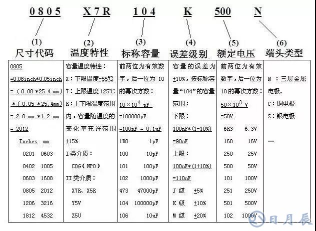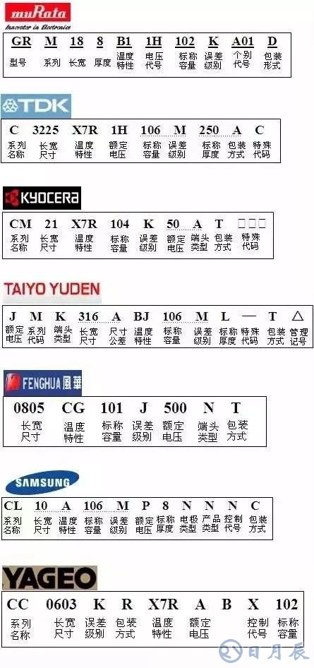 各制造商的產品規(guī)格命名規(guī)則形式上不盡相同,但規(guī)格代號中基本上都包括:尺寸、溫度特性、標稱容量、容量誤差級別、額定電壓和包裝方式等信息。